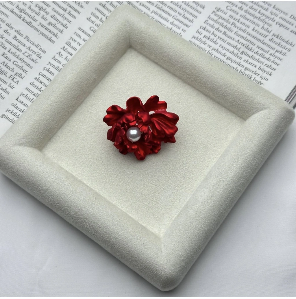 Kırmızı İnci Detay Gül Model Broş